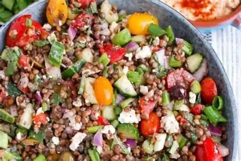 C'est une recette idéale pour la préparation à l'avance, riche en fibres, en protéines végétales et en goût, avec environ 350–400 kcal par portion (selon la quantité de feta et d'huile).